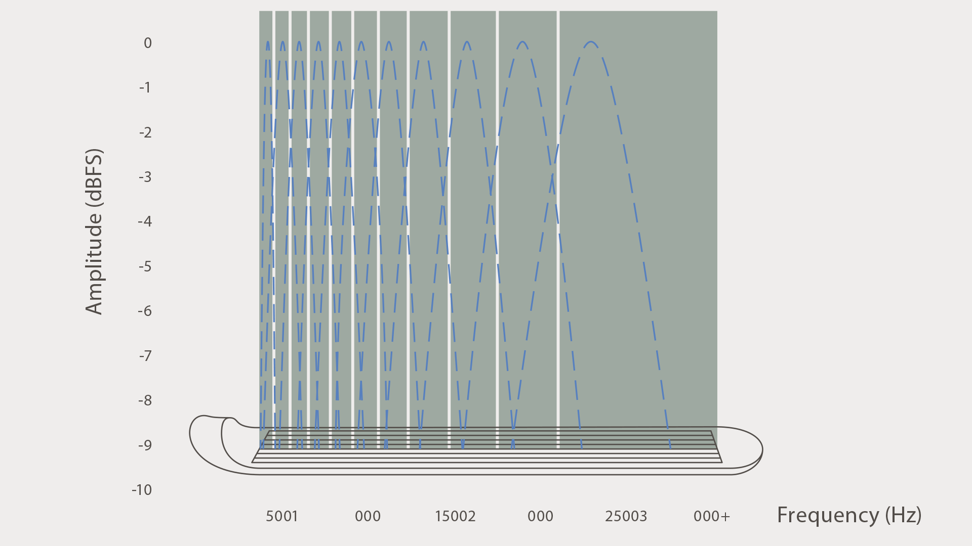Our time-domain filter bank mimics the auditory filters in the cochlea, with narrower bands for low frequencies and wider ones for high frequencies. With fewer bands, we reduce delay, delivering a clearer and more natural sound in hearing aids./p>