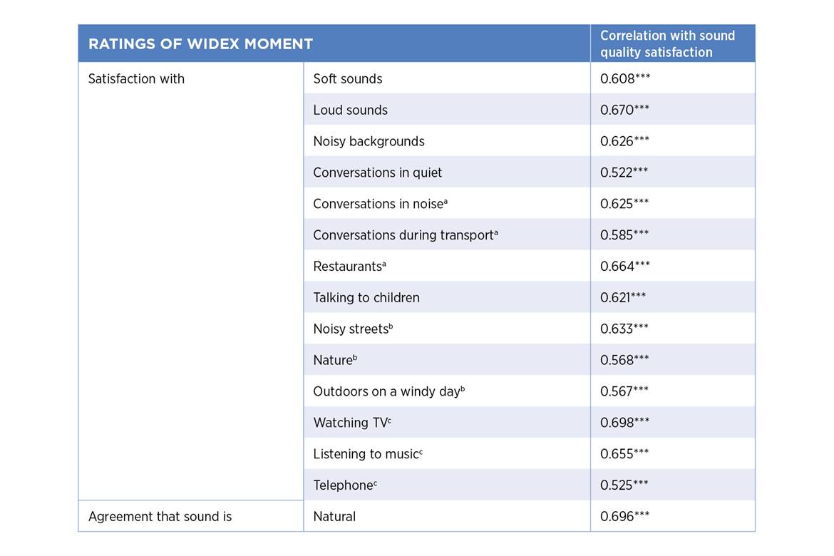 Table 1. Spearman Rho correlations between sound quality satisfaction and satisfaction in specific situations for WIDEX MOMENT. (Notations: *** indicates significance at the p<0.001 level; a) Speech-in-noise situations; b) Outdoor situations; c) Listening through devices.