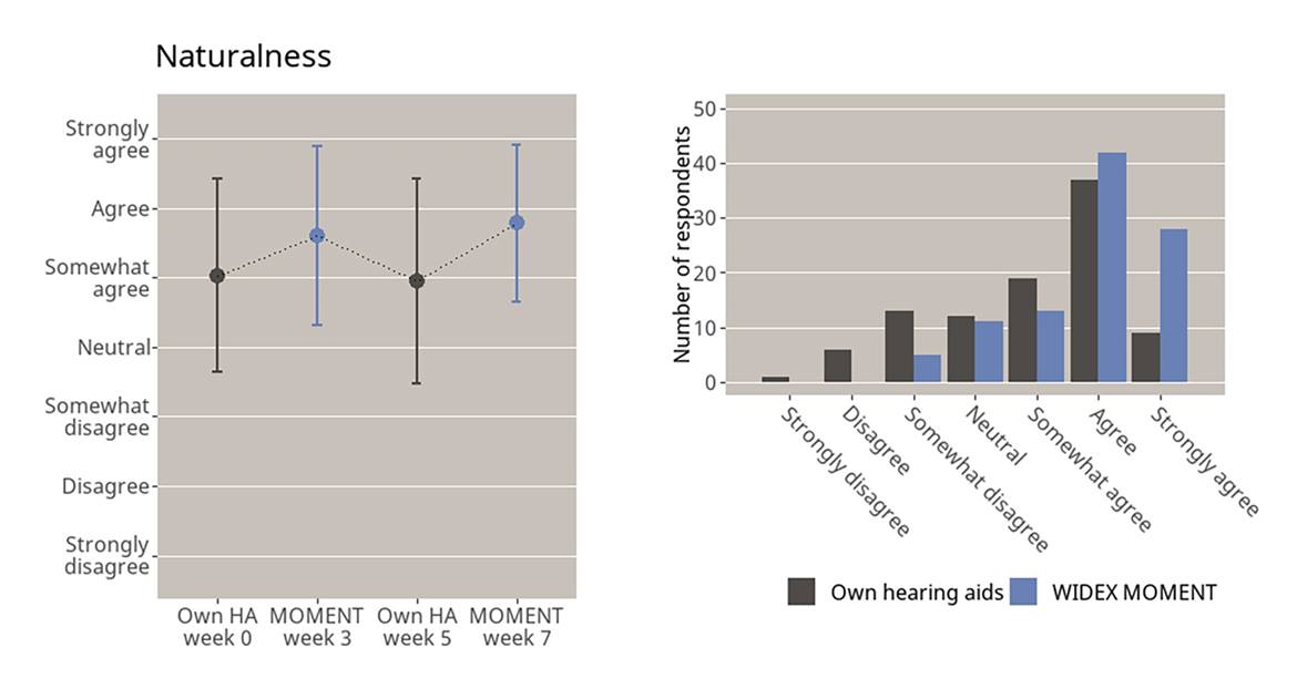 In addition, naturalness ratings show a very similar pattern across weeks to sound quality satisfaction, as illustrated in Figure 2. Again, we see approximately a 1-point difference between the ratings of own and MOMENT hearing aids, and many more who “Agree” or “Strongly agree” that the sound of MOMENT is natural.