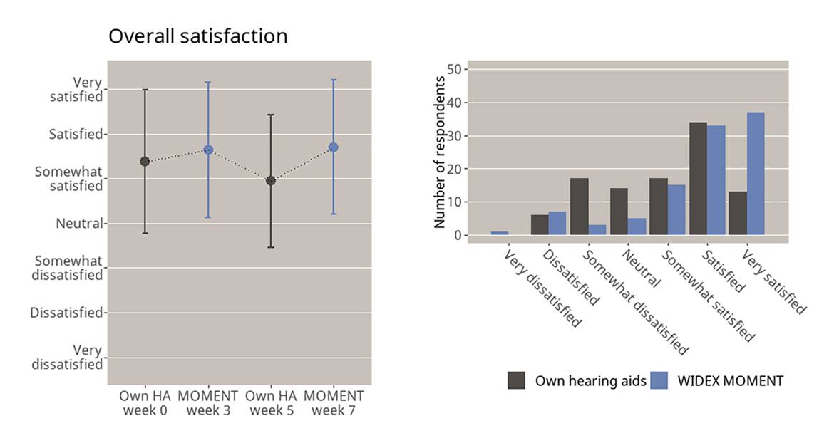 Figure 5. Ratings of overall satisfaction, with the left panel showing mean ratings per week and the right panel showing ratings for own hearing aids in Week 5 and for MOMENT in Week 7.