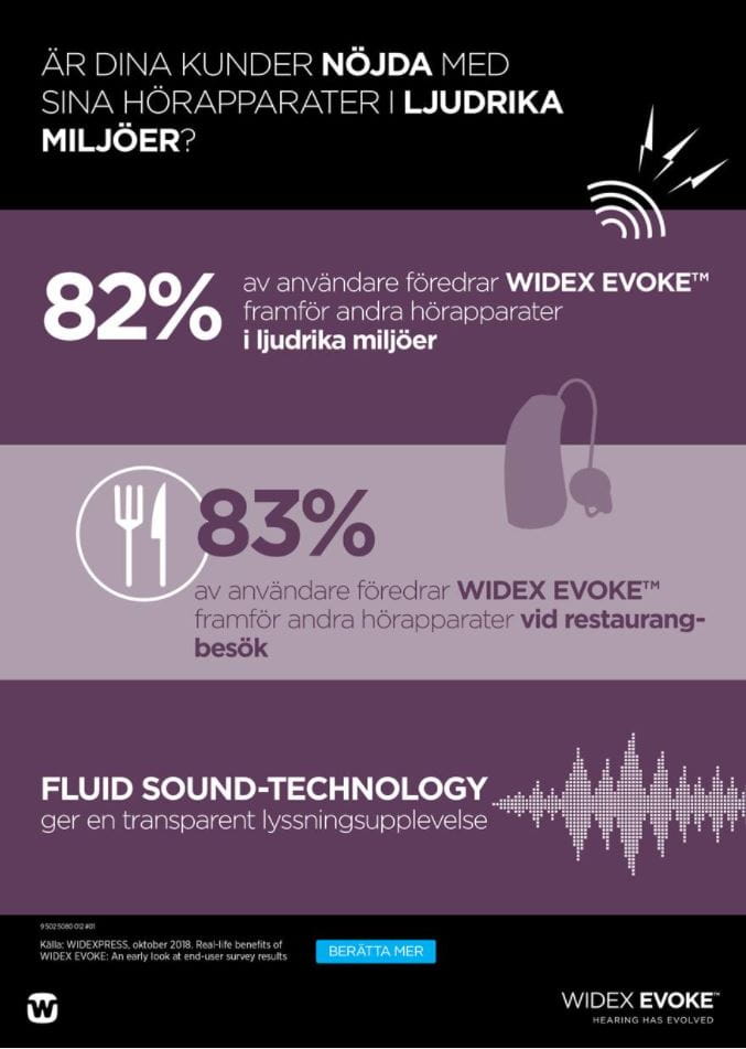 I vår nöjdhetsundersökning föredrog deltagarna EVOKE. Det berodde kanske på att denna hörapparat använder avancerad teknik för att skapa och leverera ett riktigt rent och personligt ljud – även i restauranger. Ta en titt på infografiken.